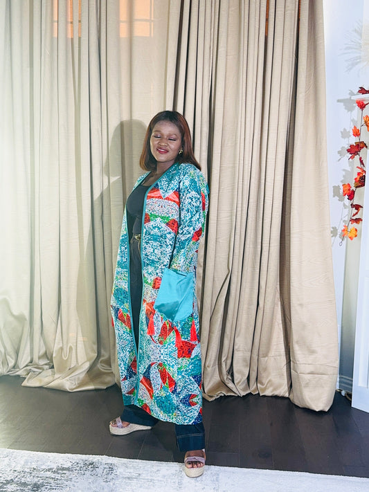 Adetola Adire African print Aso oke Kimono Duster with pockets (Green)