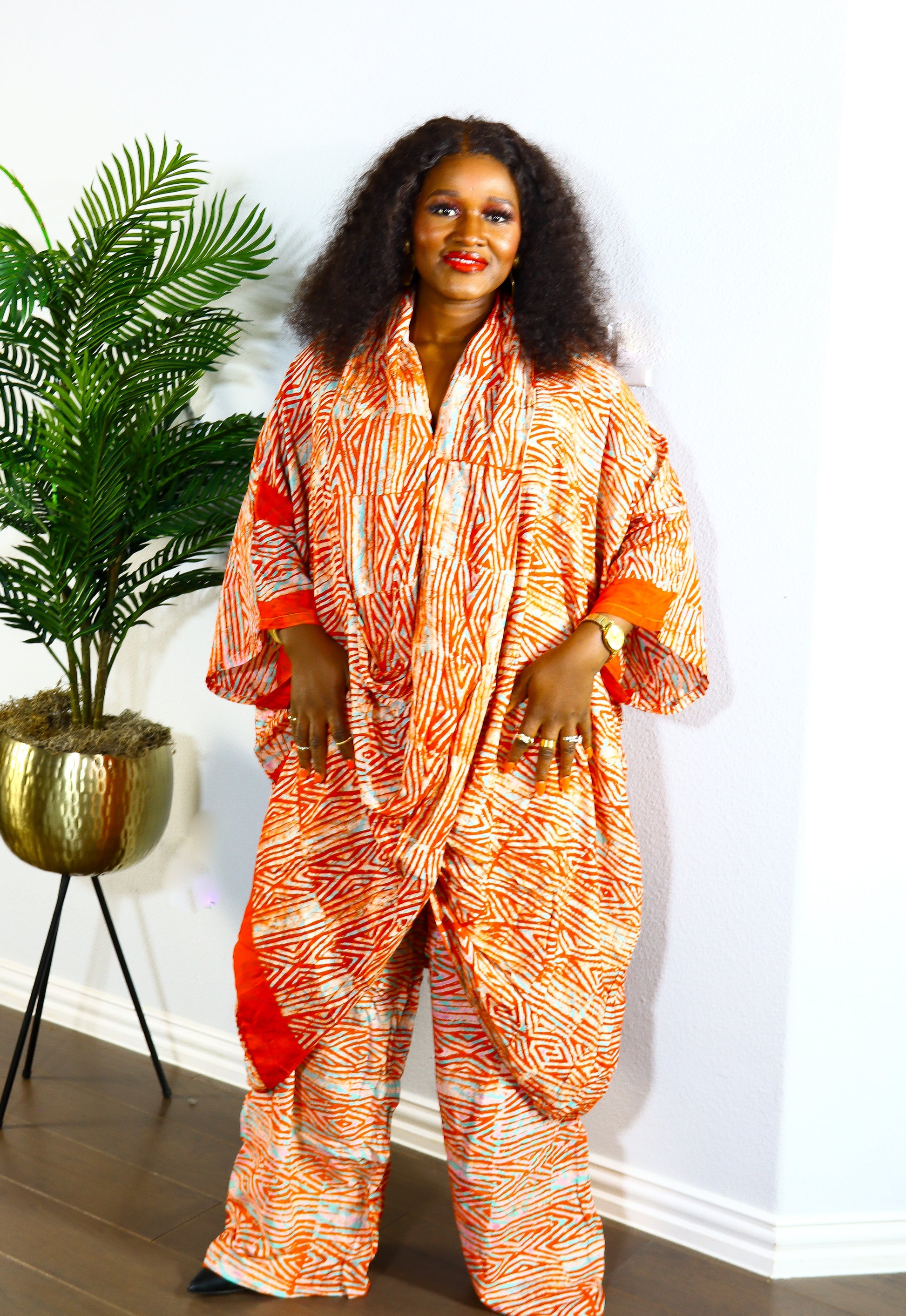 Introducing the Aderonke Wrap blouse and pant adire set in Blue. Embody comfort, style, and regality with this must-have set. The breathable fabric provides luxurious comfort for all occasions, from brunch to church. Elevate your wardrobe with this exclusive set.