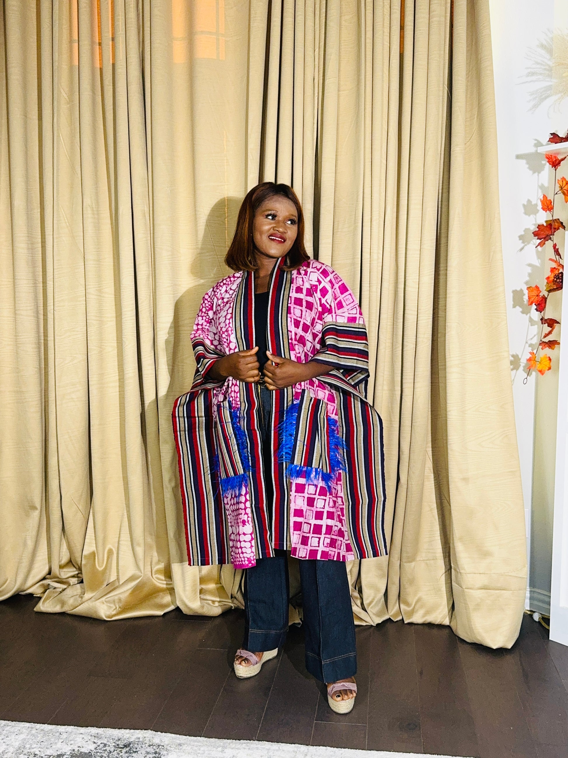 Adetola Adire African print Aso oke Kimono Duster with pockets (Pink)