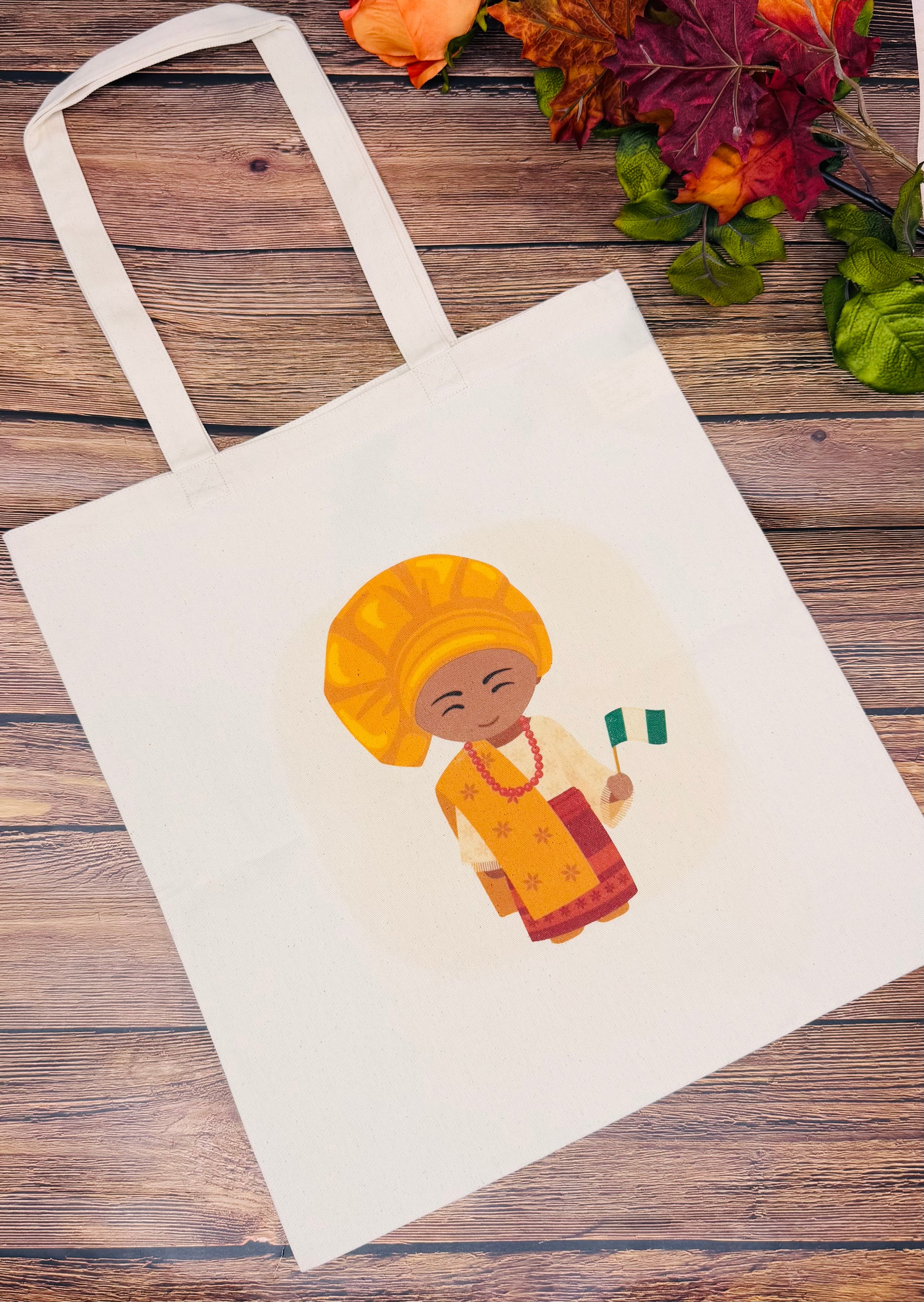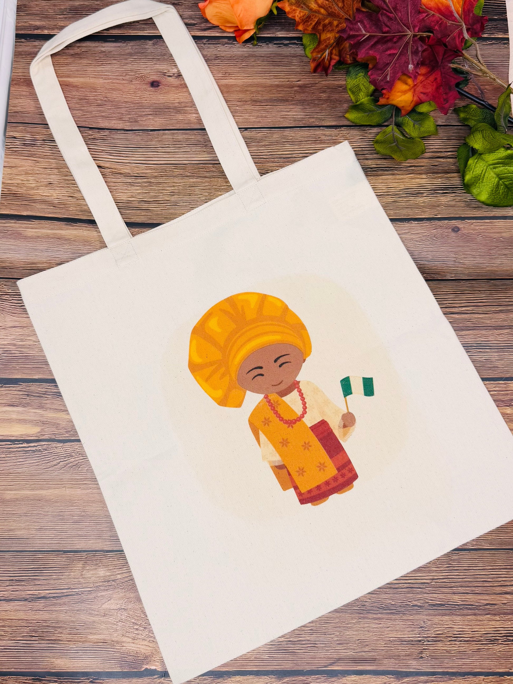 Introducing our Canvas Naija women Afrocentric tote bag, perfect for showing off your love for Nigerian fashion! Made with durable canvas, this bag features a unique graphic design that captures the vibrant owanbe culture. Measuring 15X16 with a 10 inch handle, it's the perfect accessory for hangouts, shopping, beach etc