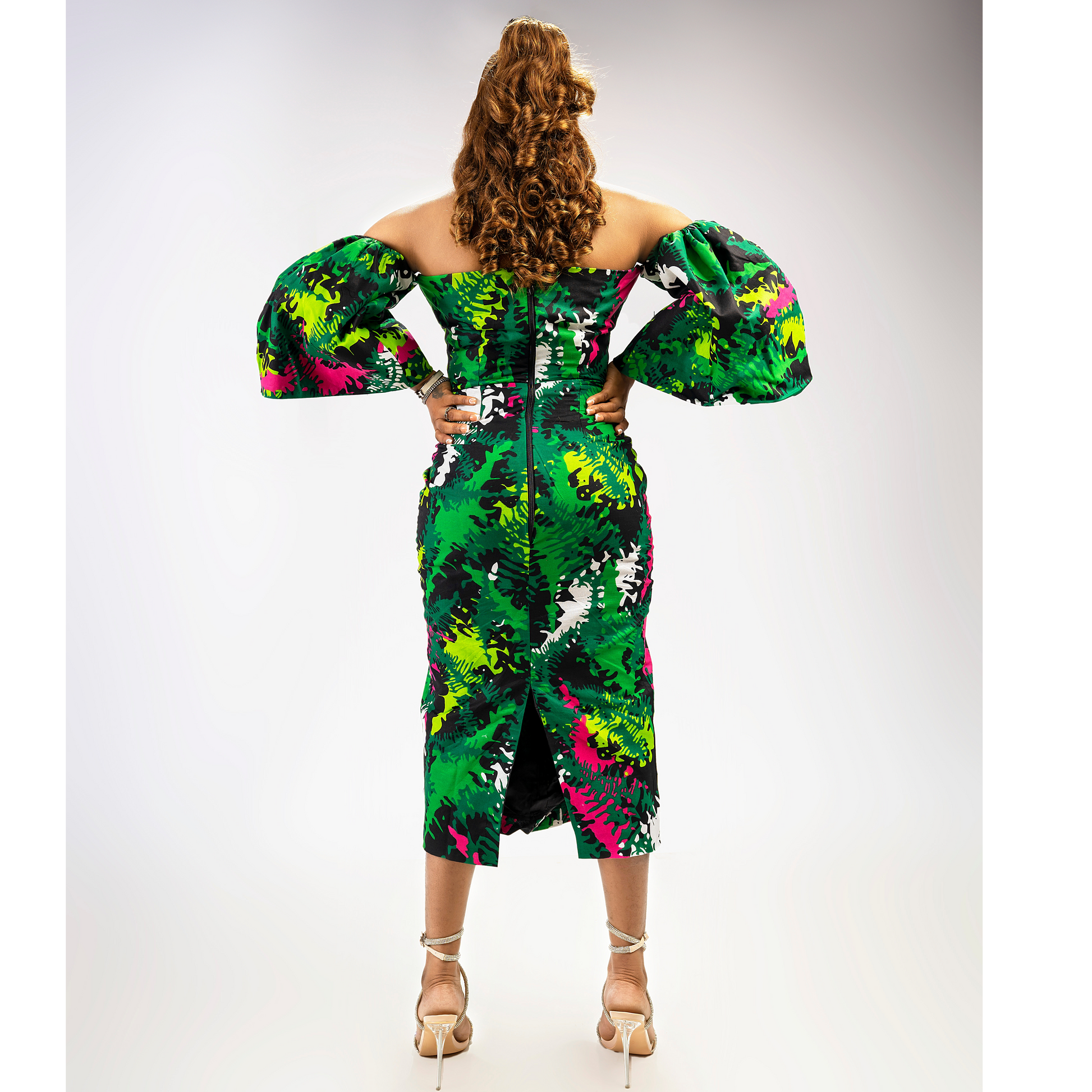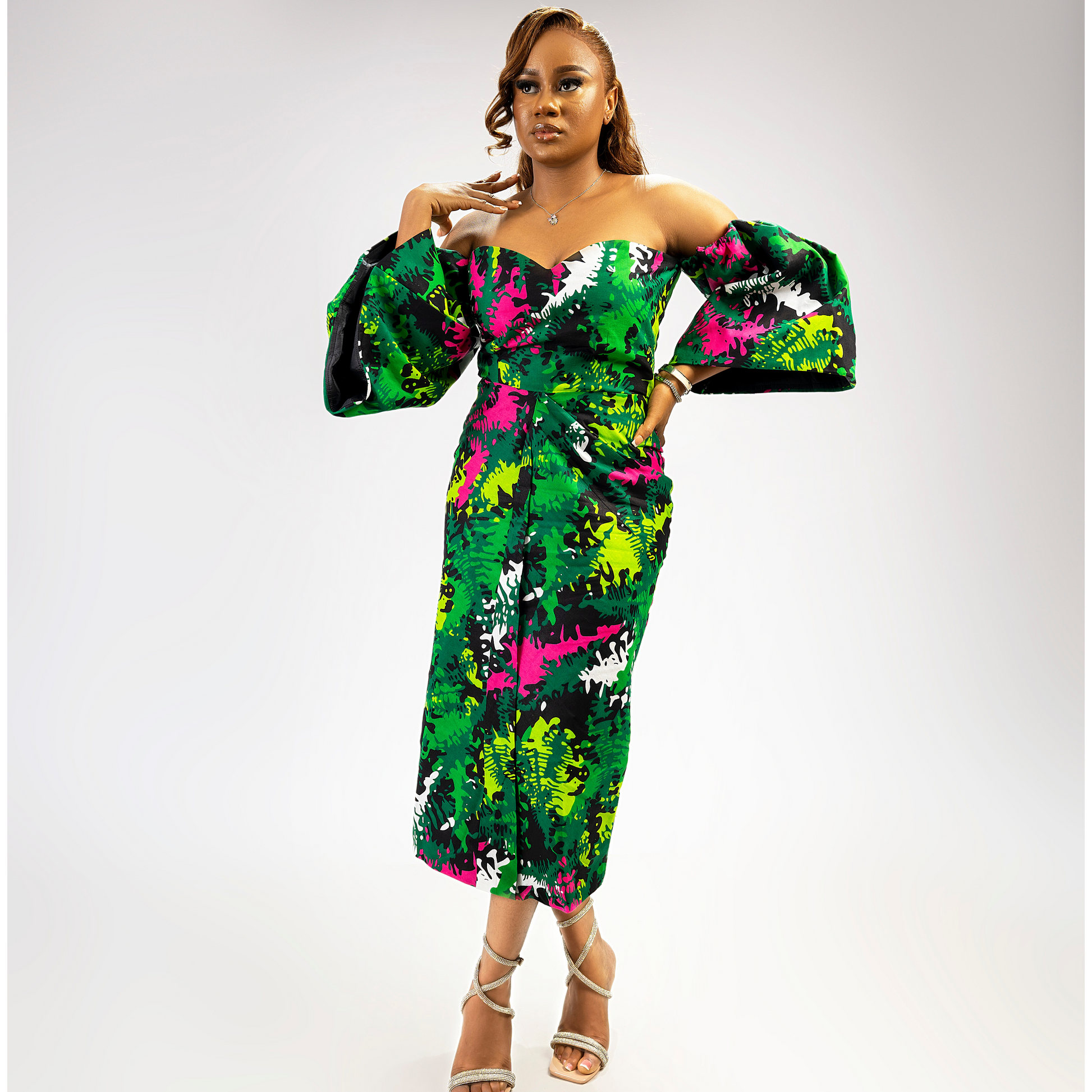 Transform your wardrobe with our Chinara African print dress. The puffy sleeves and off shoulder design add a touch of femininity, while the ruched detail and fitted silhouette create a flattering look. Perfect for any occasion, this midi length dress will be your go-to for effortless style!