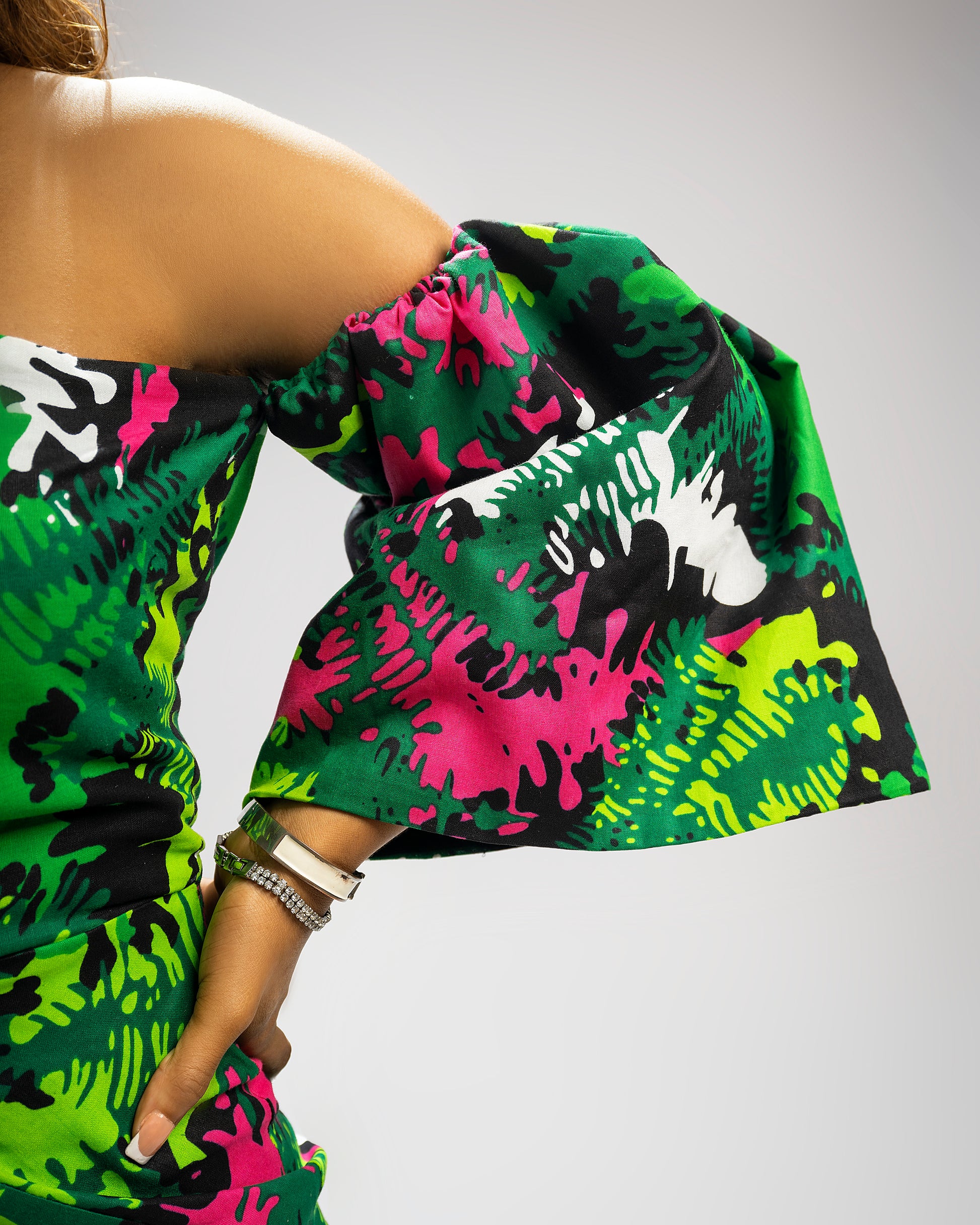 Chinara African print puffy sleeves off shoulder ruched detail dress for women