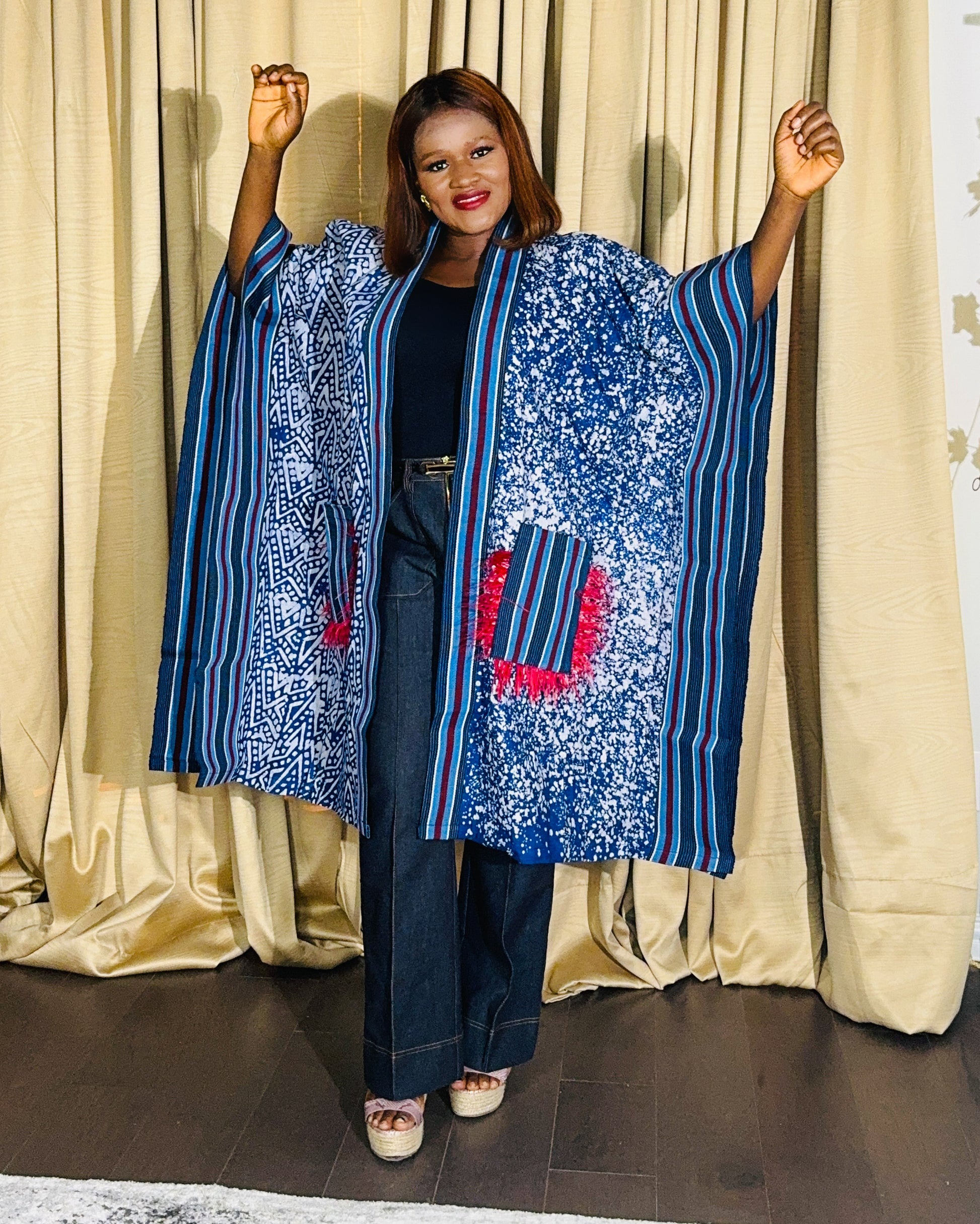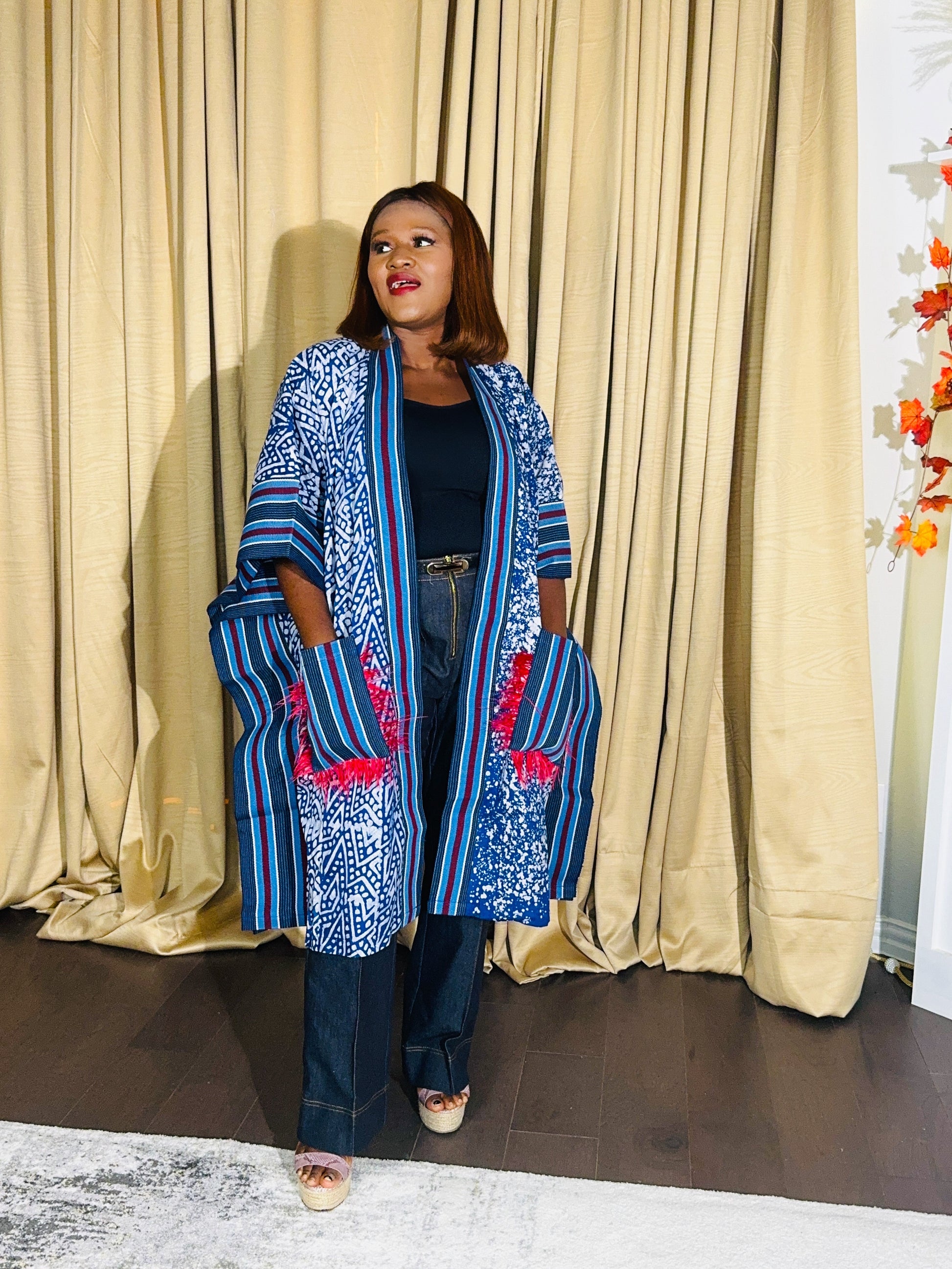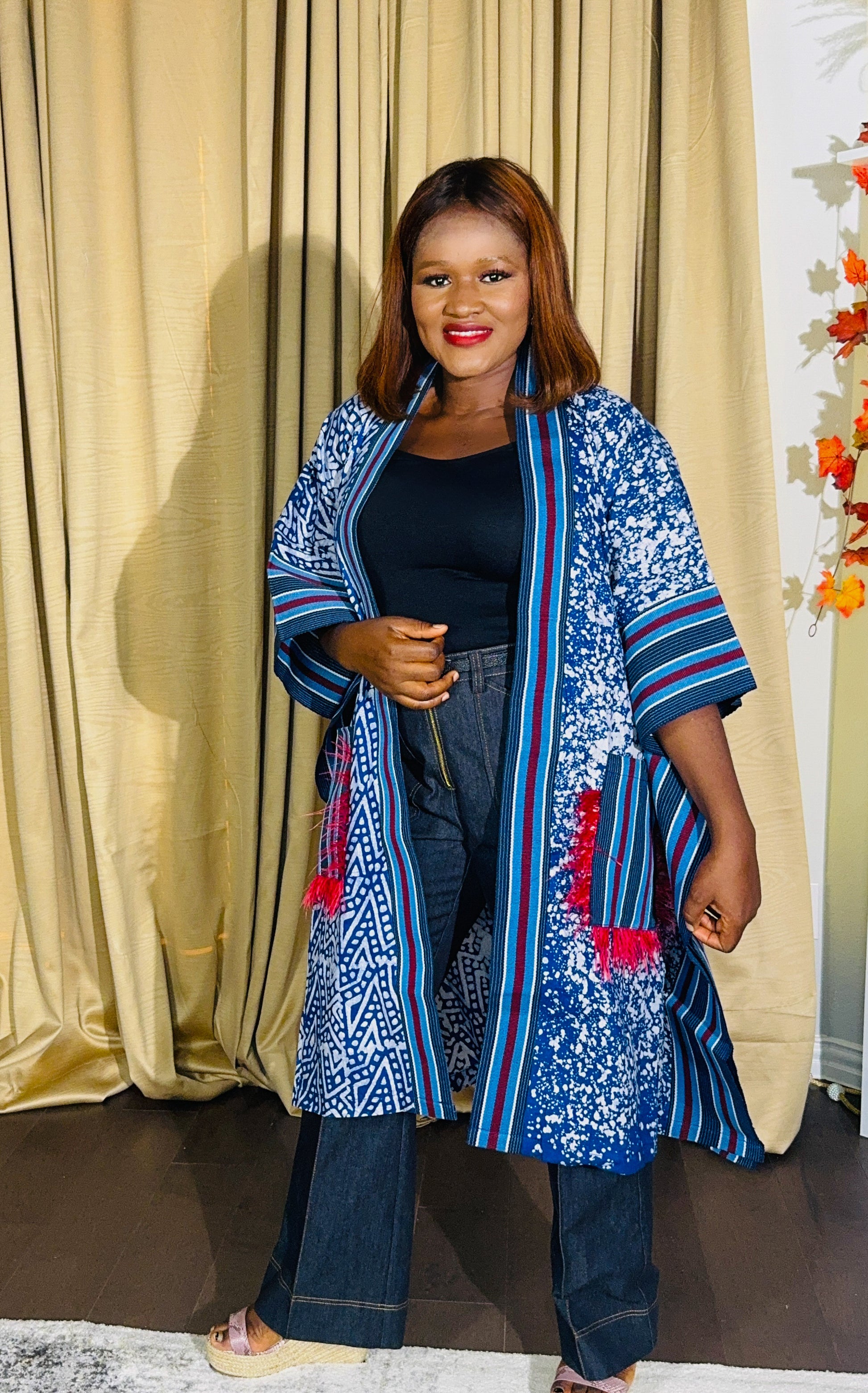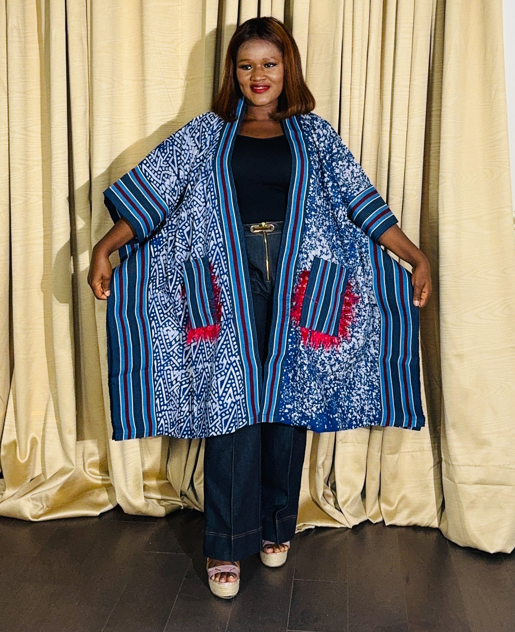 Adetola Adire African print Aso oke Kimono Duster with pockets (Blue)