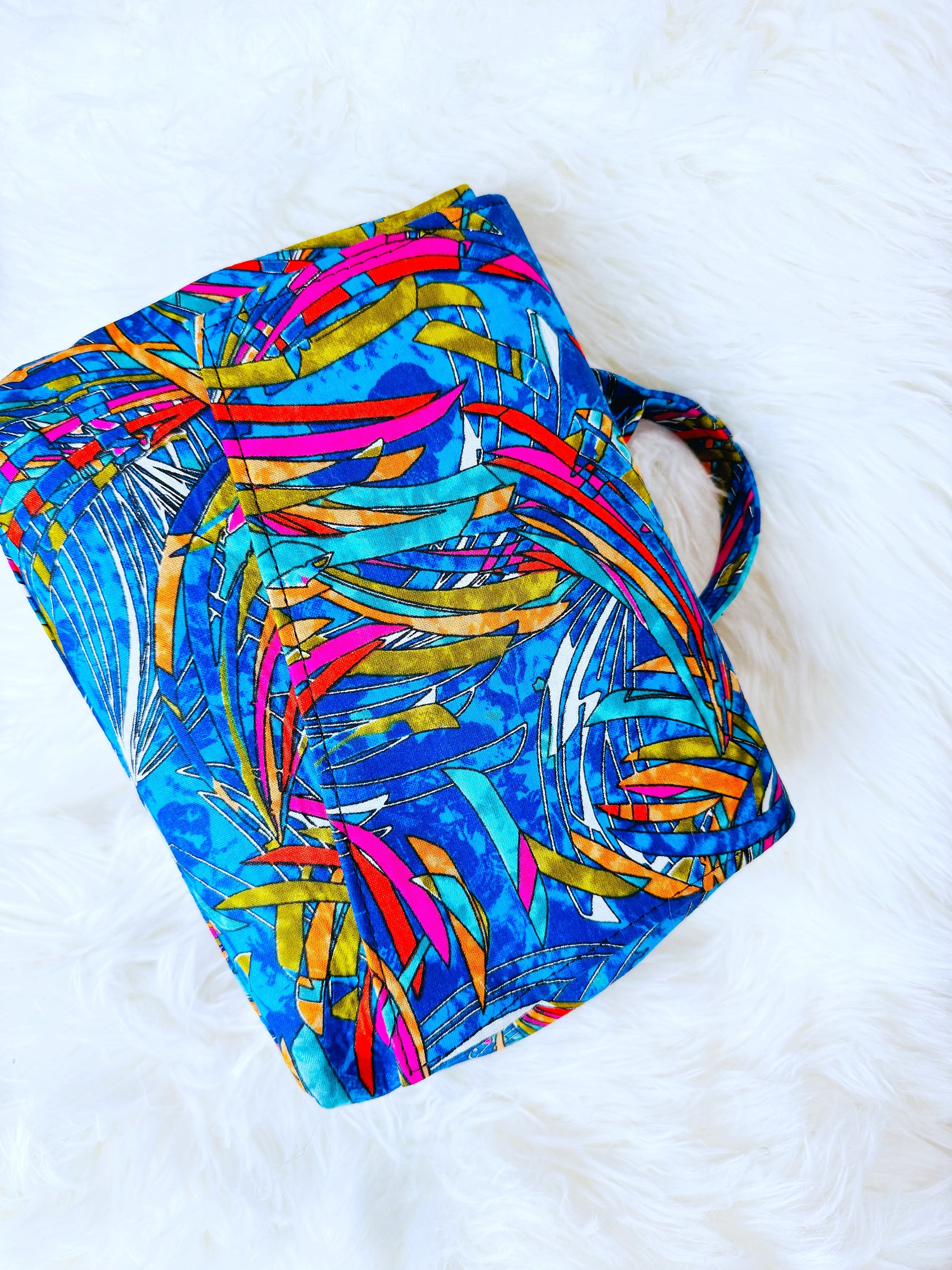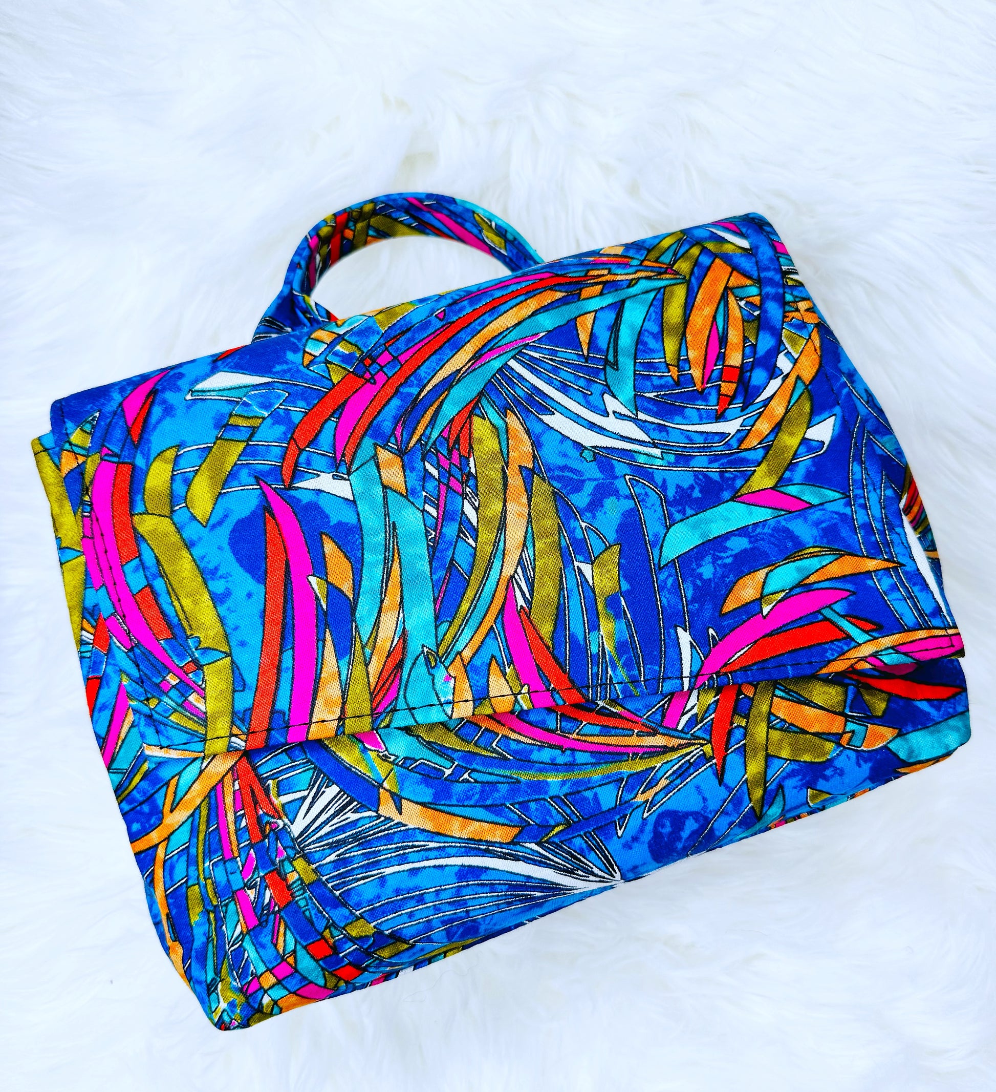 With two different styles on each side, this purple multicolor bag offers versatility and the ability to switch up your look at any time.
