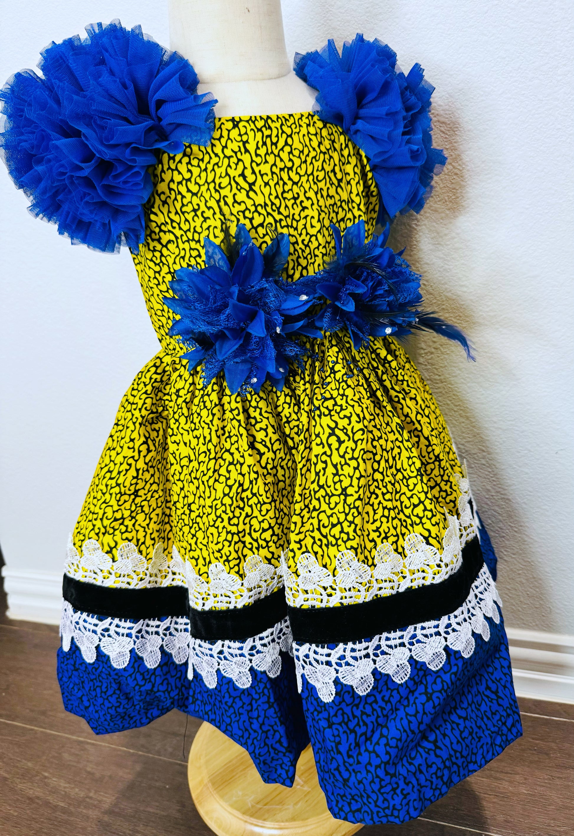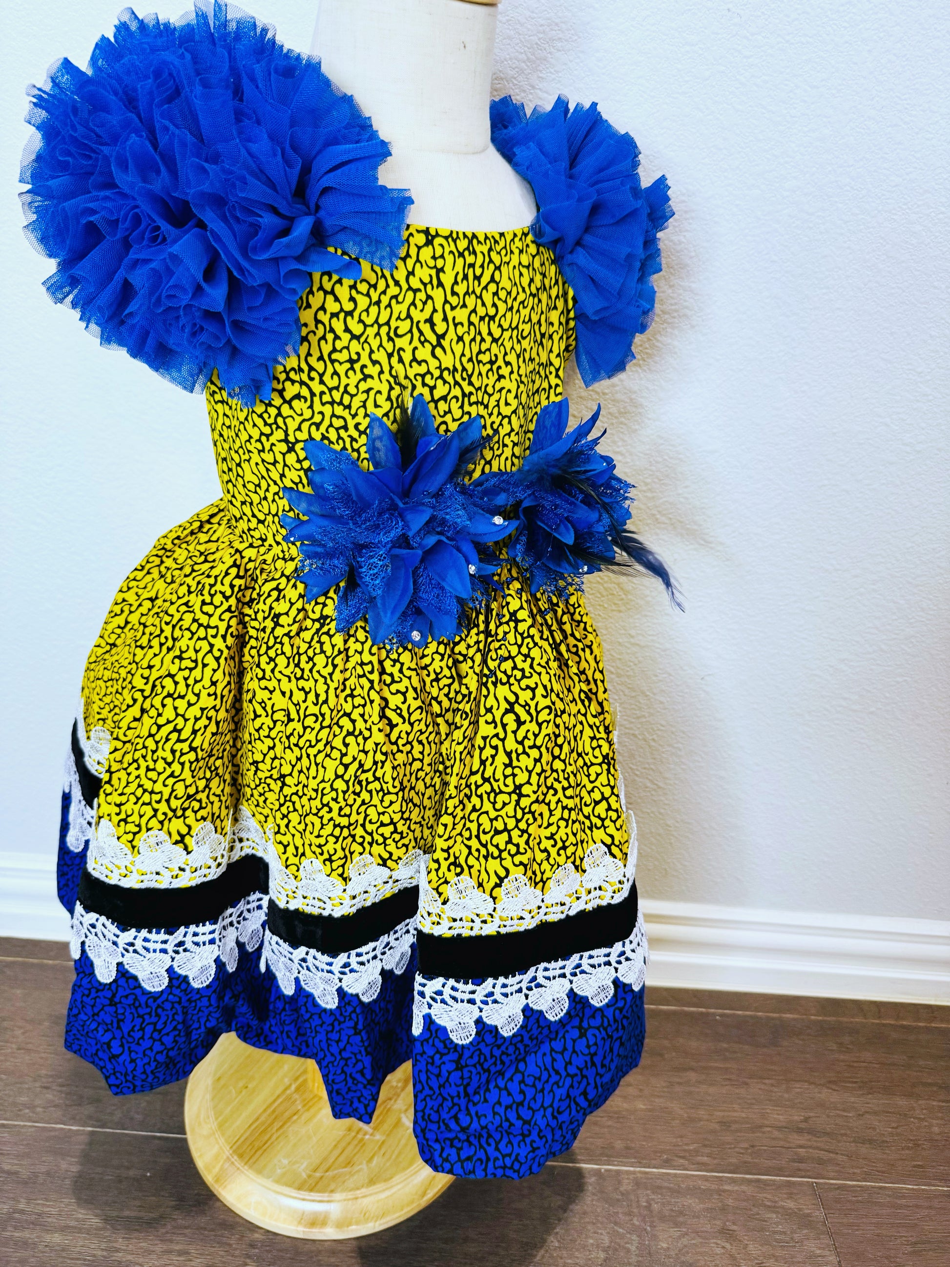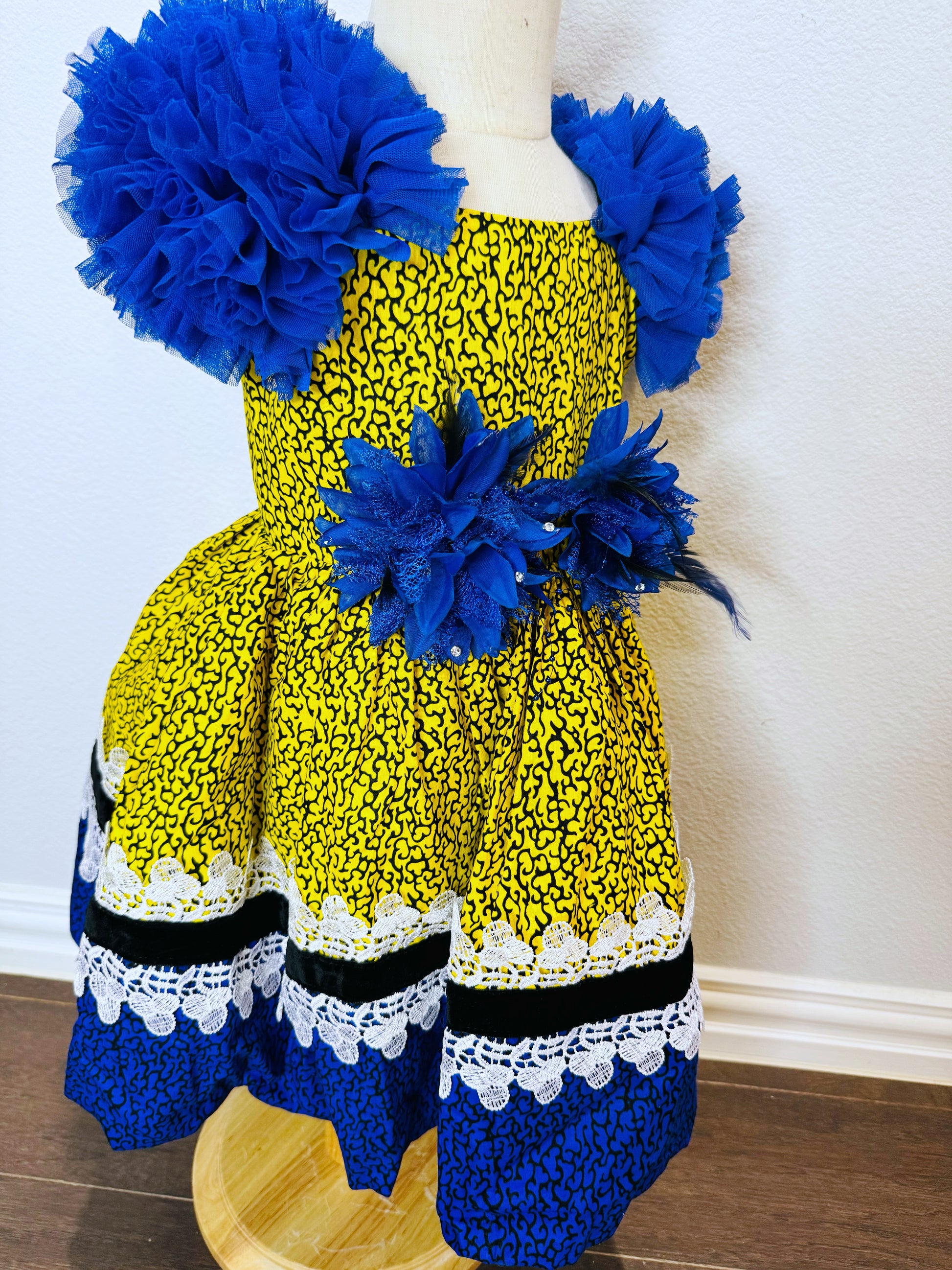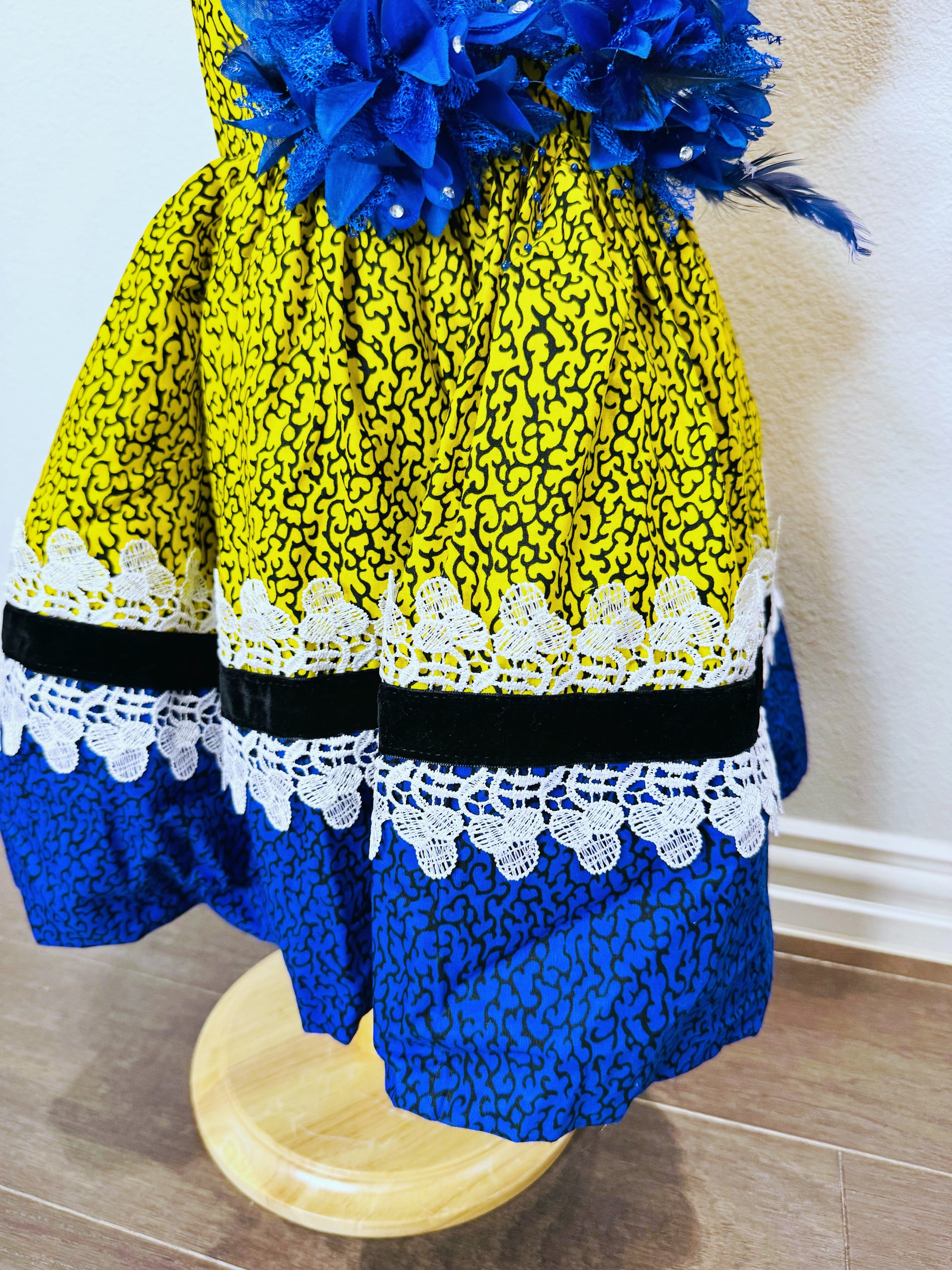 Made with 100% African print cotton, this perfect combination of yellow and blue dress is a lovely gift for any child you love. It features a zipper closure on the back and netting layers underneath the dress that gives a flattering fit .