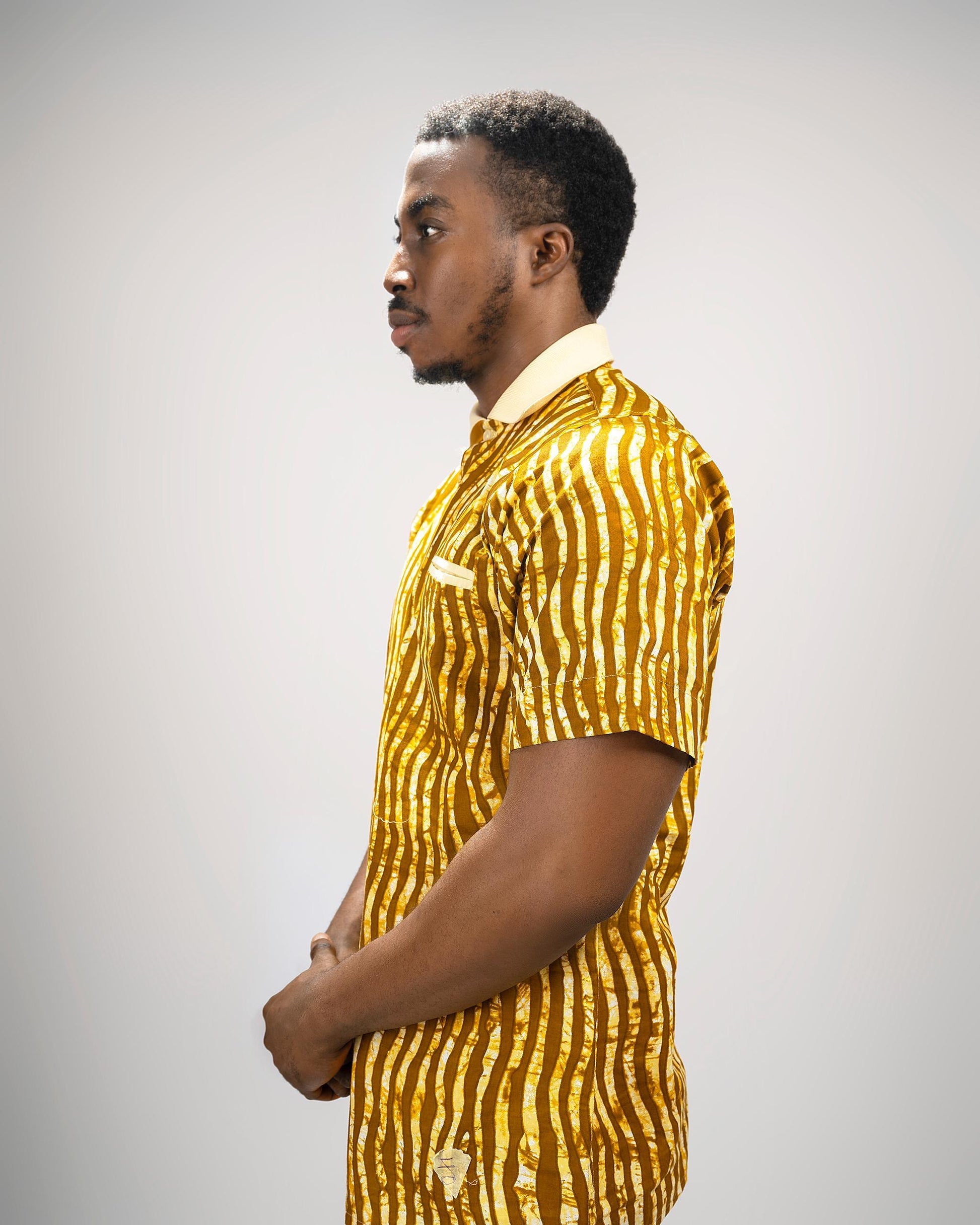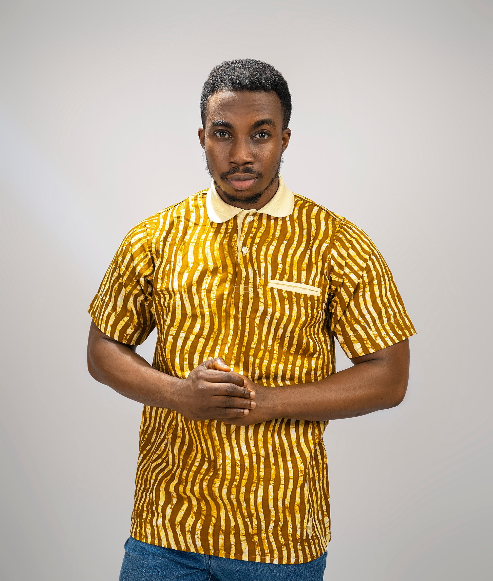 This Kene African print shirt top for Men is made from authentic cotton, featuring a polo t-shirt collar and a front pocket. Crafted with traditional African prints, it adds a touch of culture and style to your wardrobe. Comfortable and versatile, perfect for any occasion.