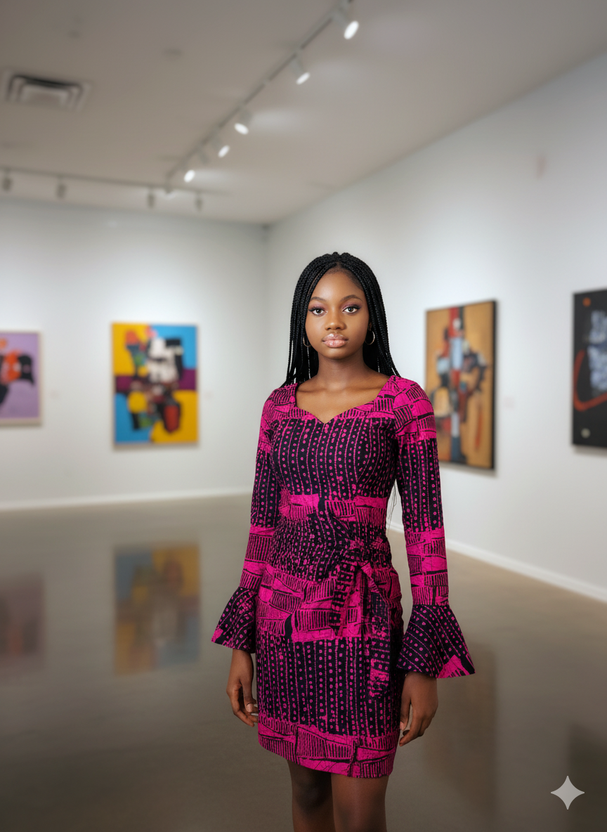 This dress is made from authentic ankara fabric, the side front wrap detail adds an element of sophistication and elegance, while the flared sleeves add a touch of femininity to the overall look. The fitted silhouette of this dress flatters the body, making it a stylish and versatile piece for any occasion.