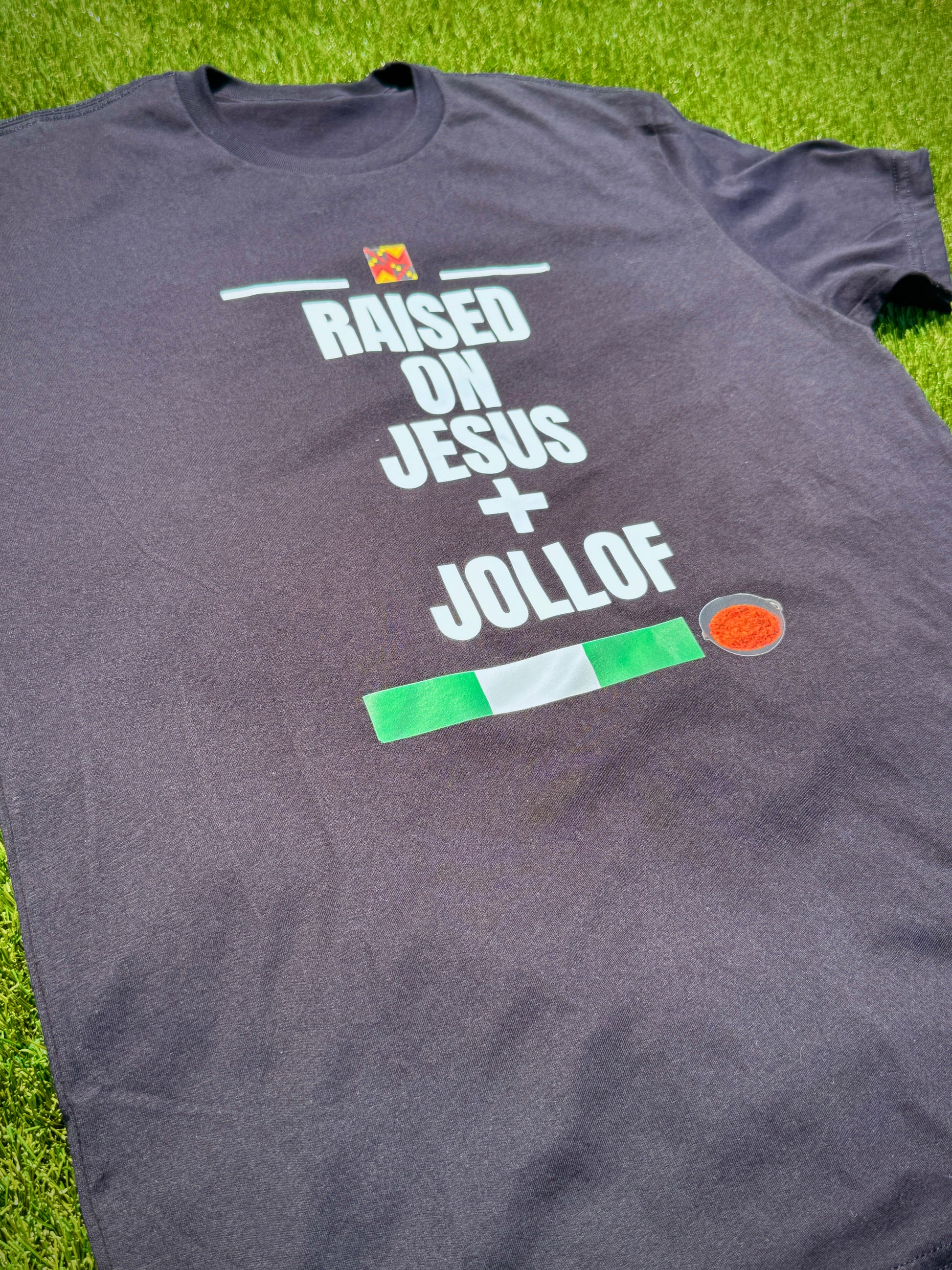 Crafted from soft, breathable premium cotton, it’s perfect for weekend brunch, family hangouts, or simply repping your identity with pride and purpose. Whether you’re flipping through Scripture or stirring a pot of smoky party jollof, this tee says it all—faith and flavor raised you right.
