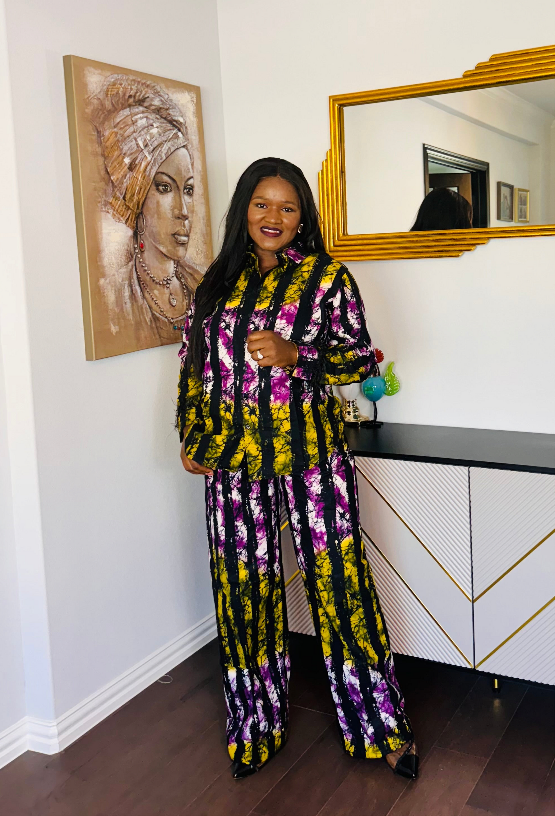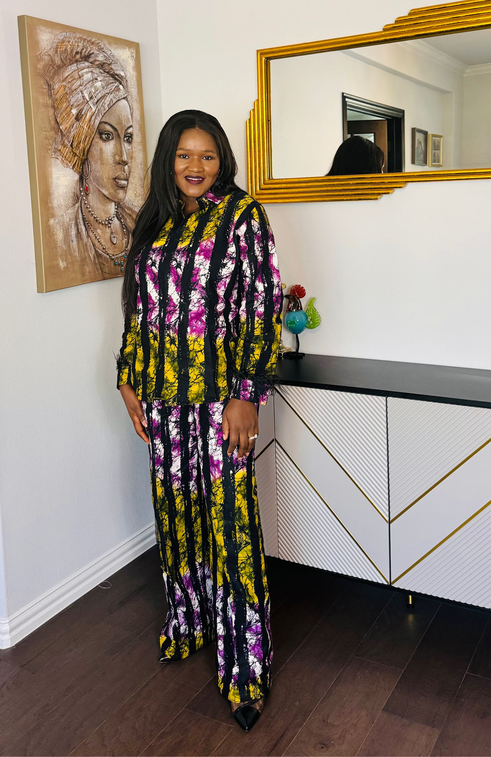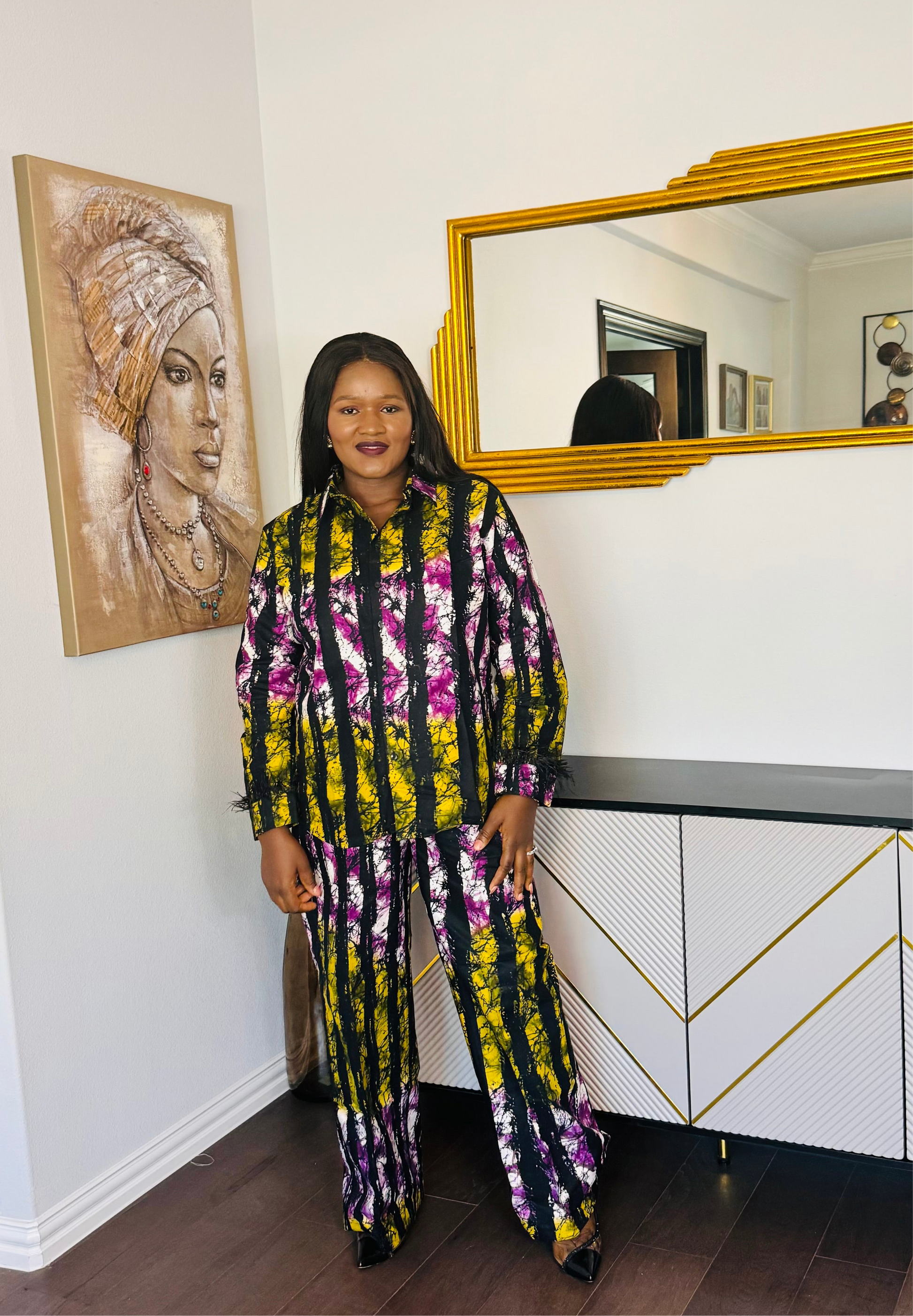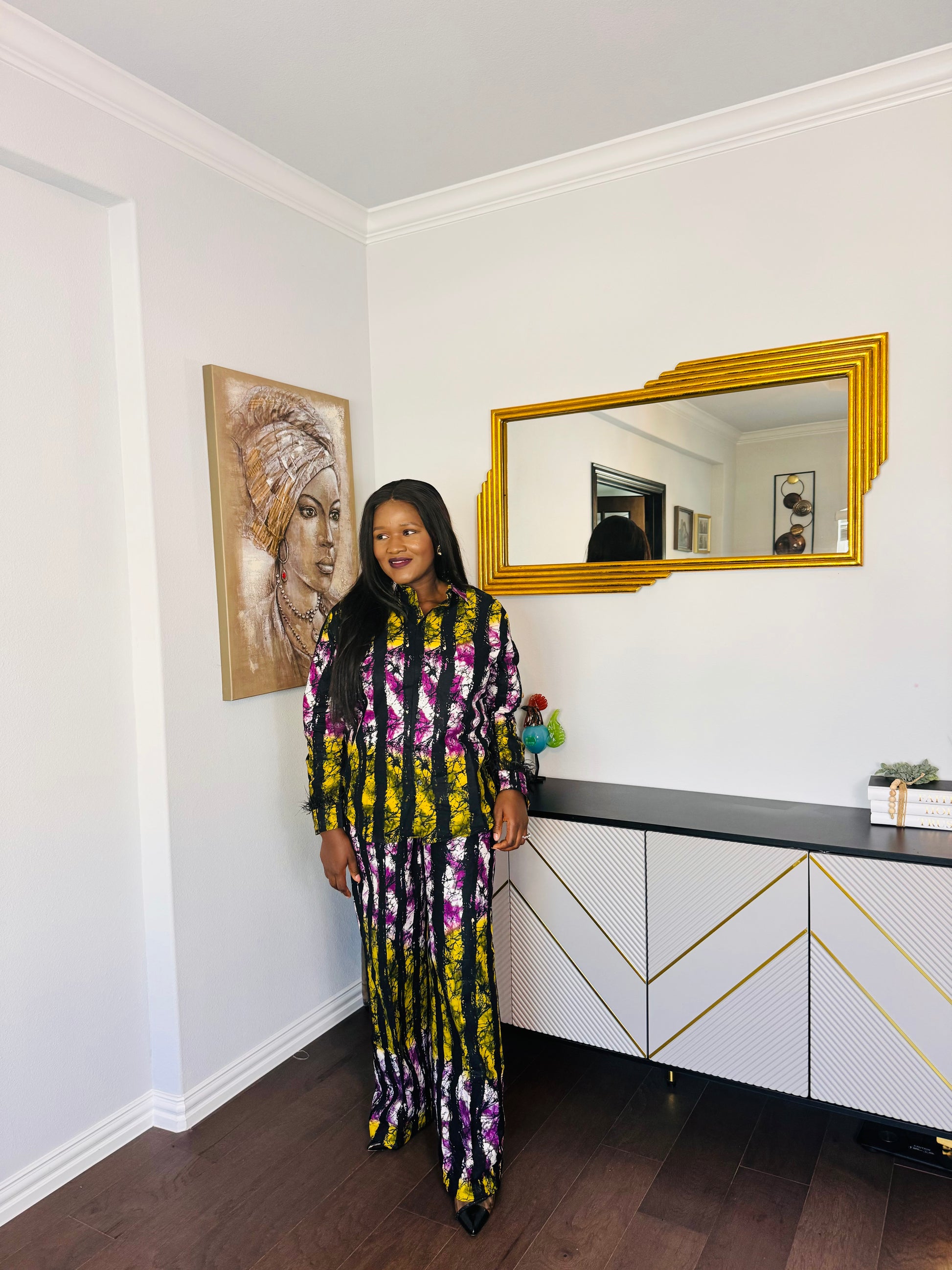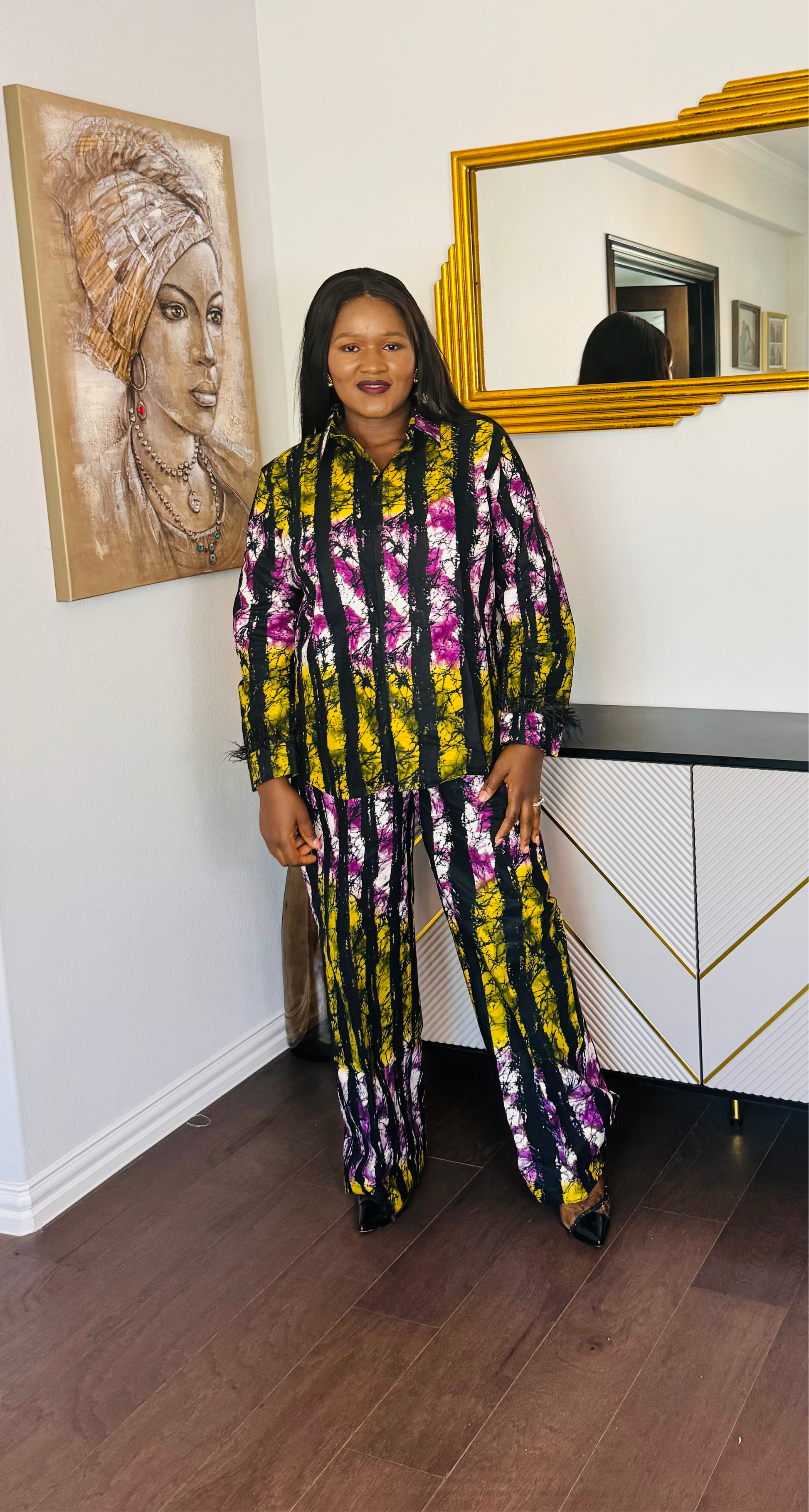 This two piece is a timeless style that will elevate your wardrobe as a true african woman. The print is so colorful and the waist band of the pants makes it an easy to wear outfit for casual and corporate outings.